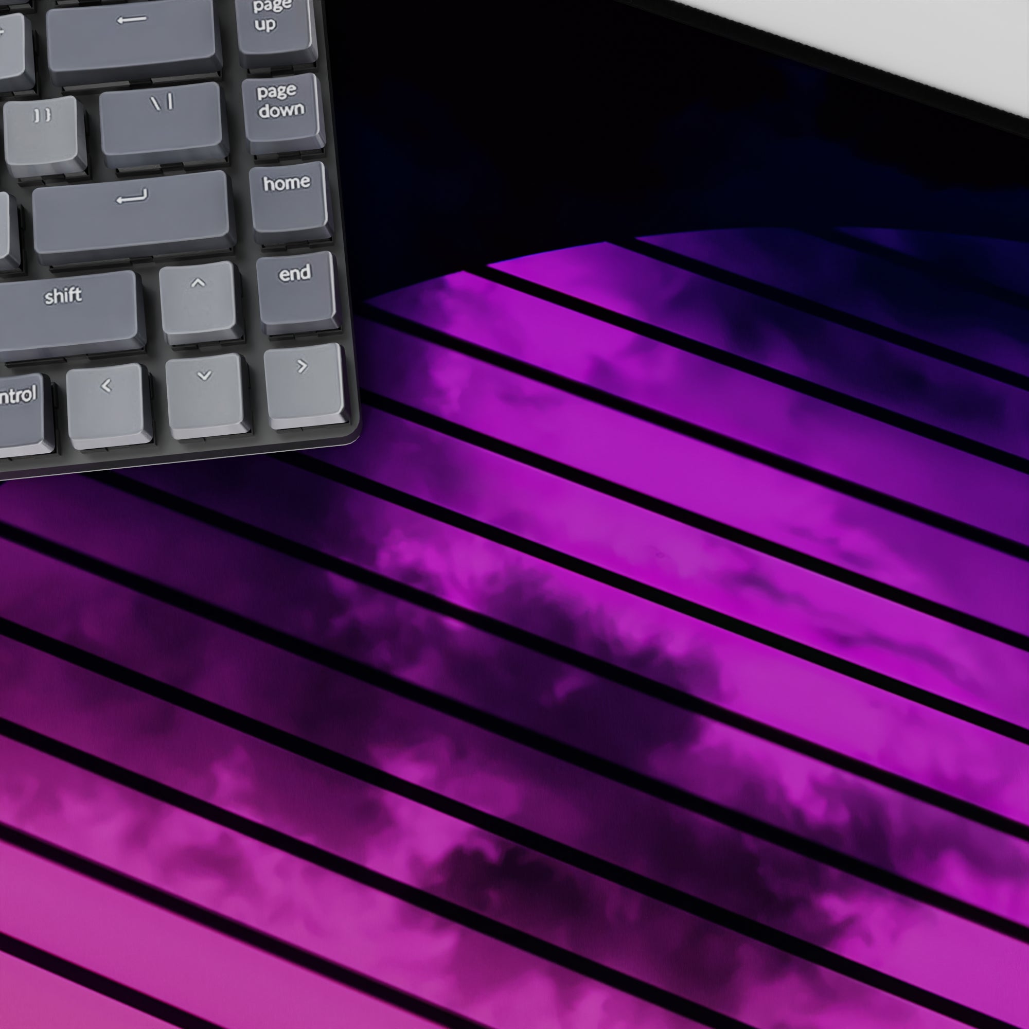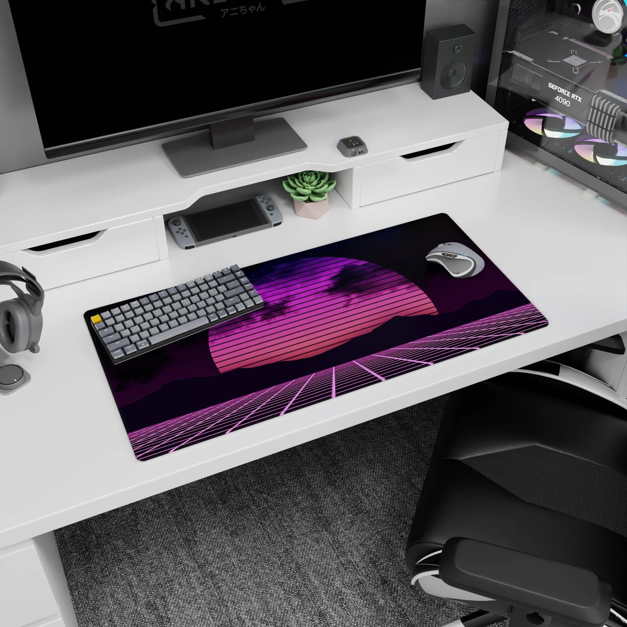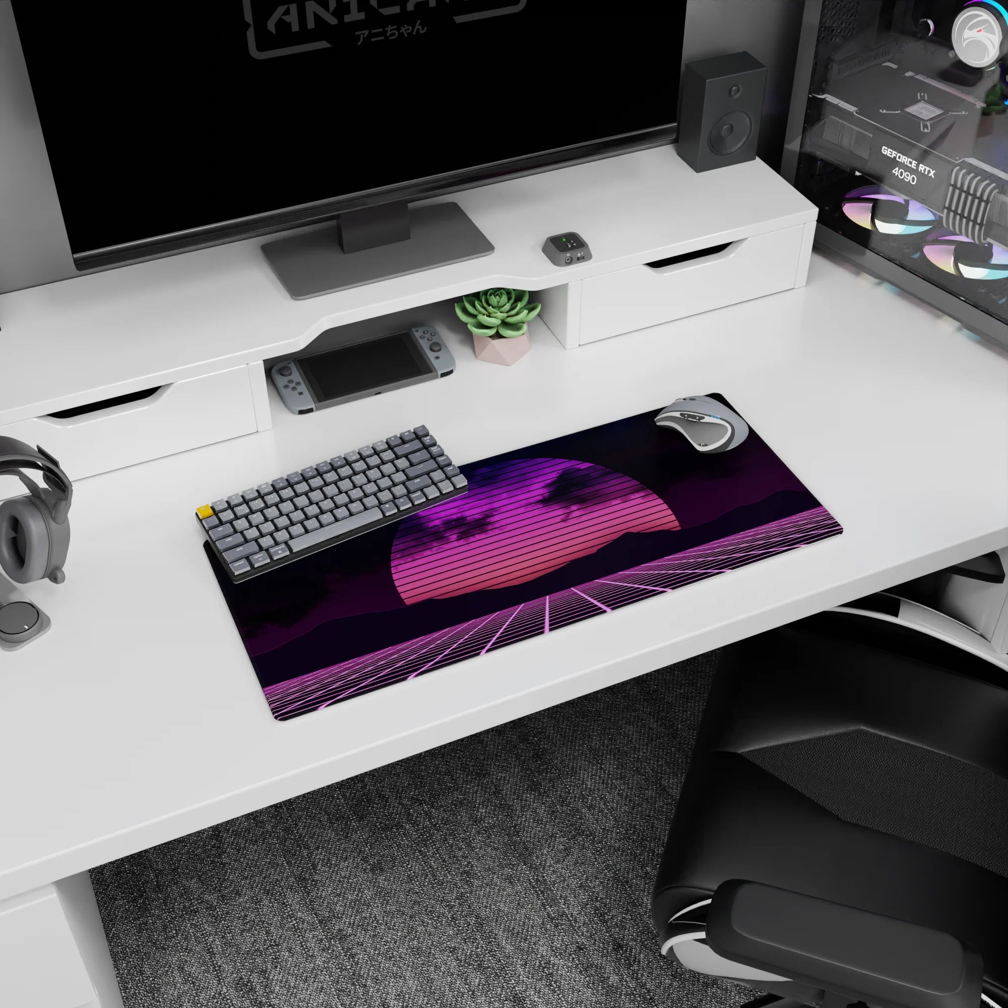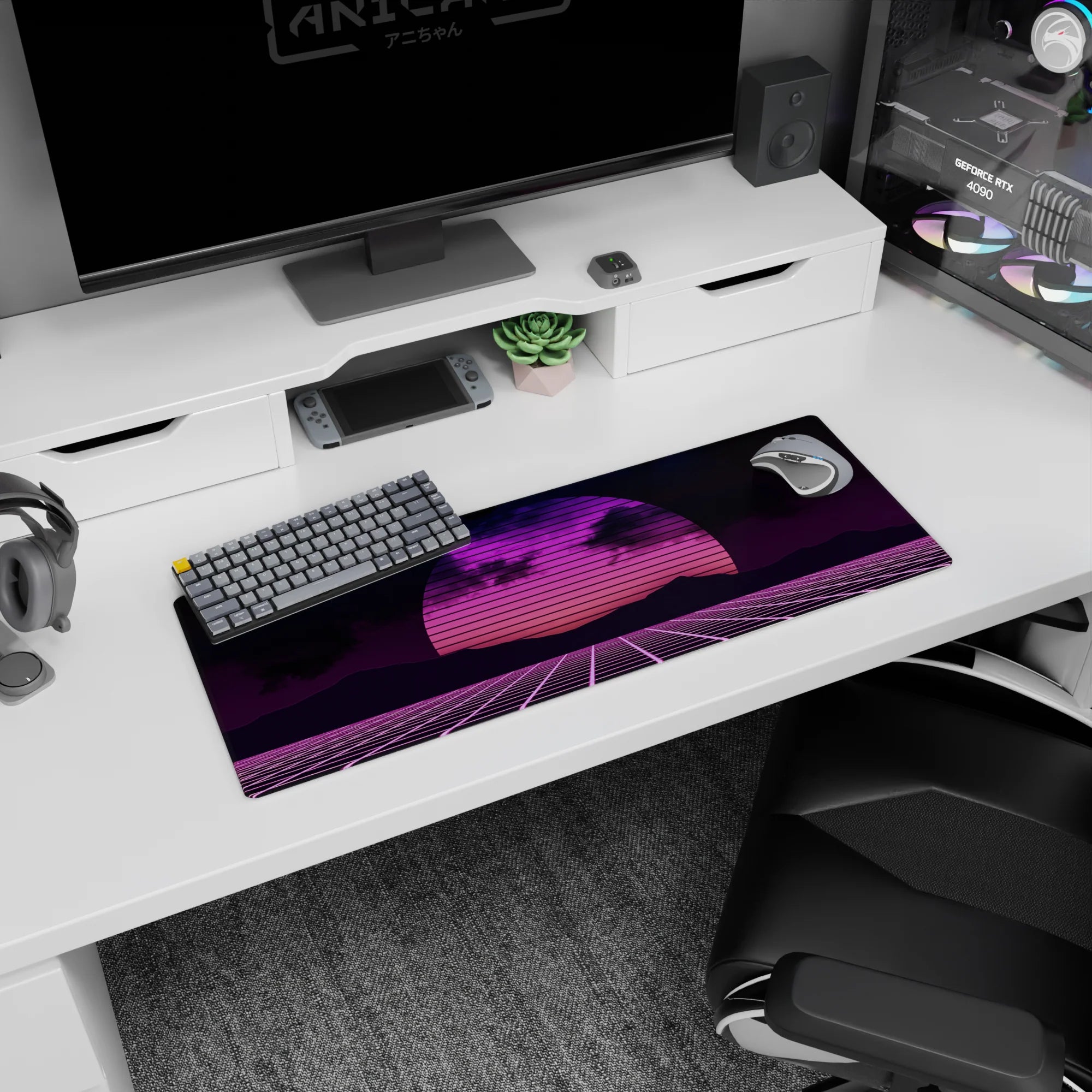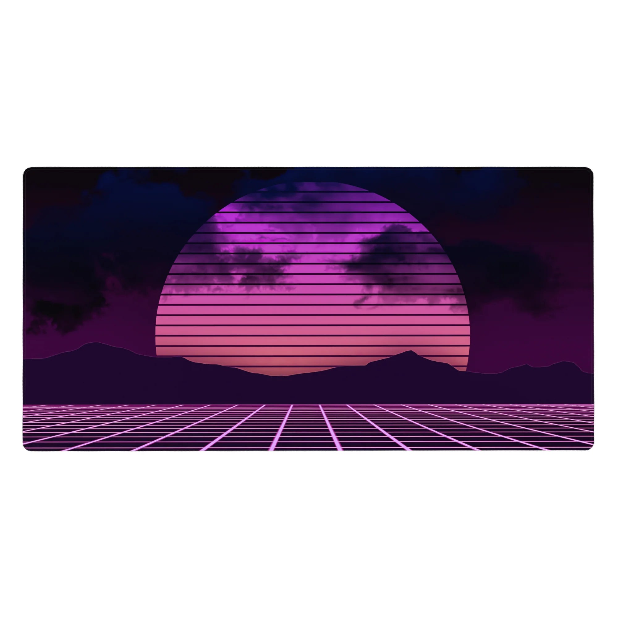 Transport your desk back to the 80s with this synthwave-inspired retrowave deskmat. Featuring a glowing neon sunset, gridlines, and bold pink and purple hues, it brings the electric energy of retro-futurism to your workspace. Perfect for fans of the synthwave aesthetic.