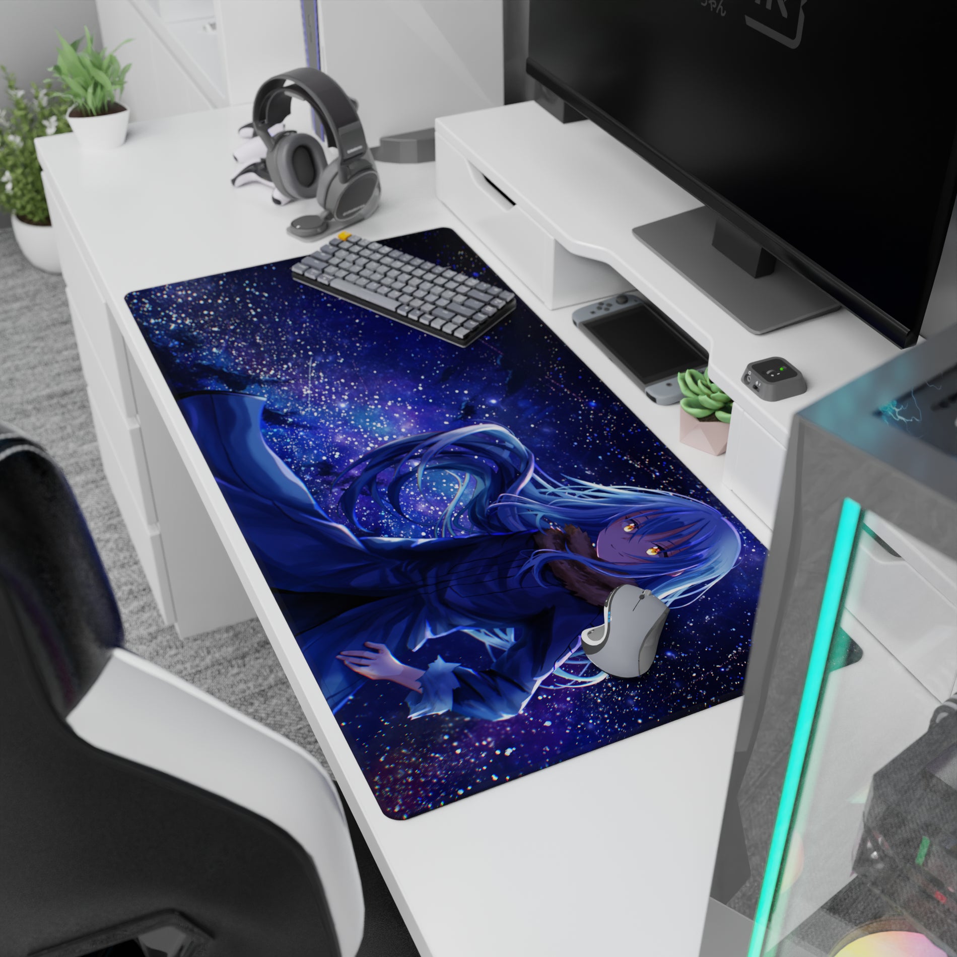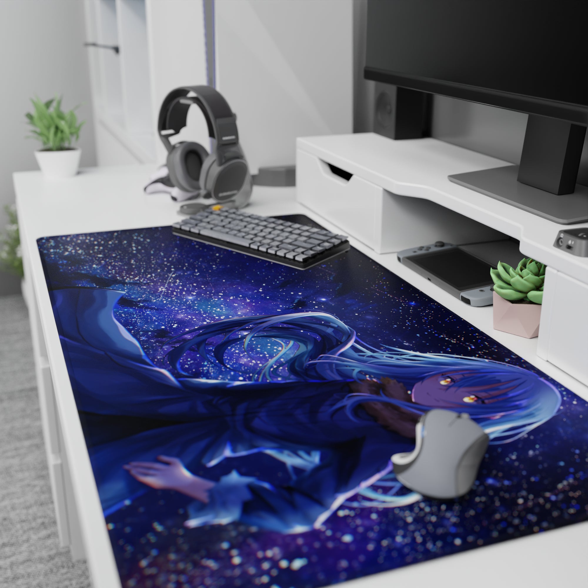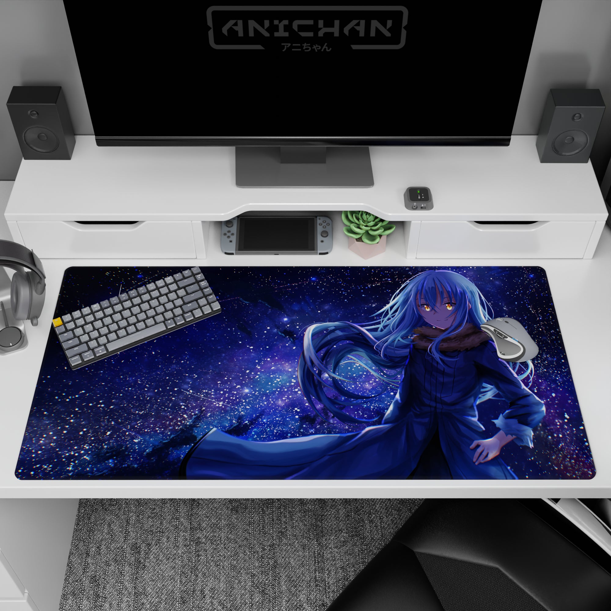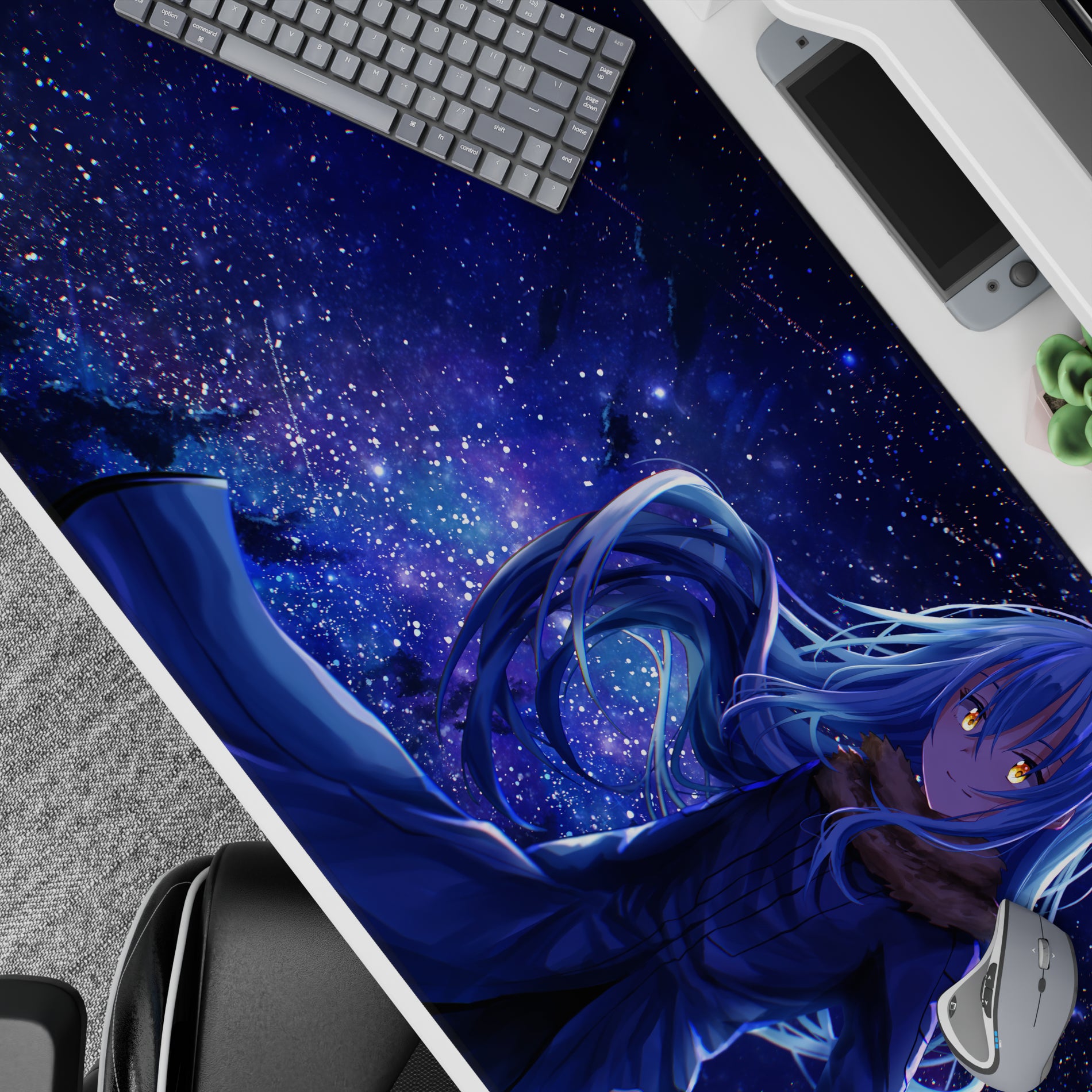Starry-night anime mouse pad inspired by That Time I Got Reincarnated as a Slime: blue-haired heroine, glowing amber eyes, navy coat with fur collar, indigo-violet galaxy tones. Smooth tracking, crisp print, cozy cosmic desk vibe.