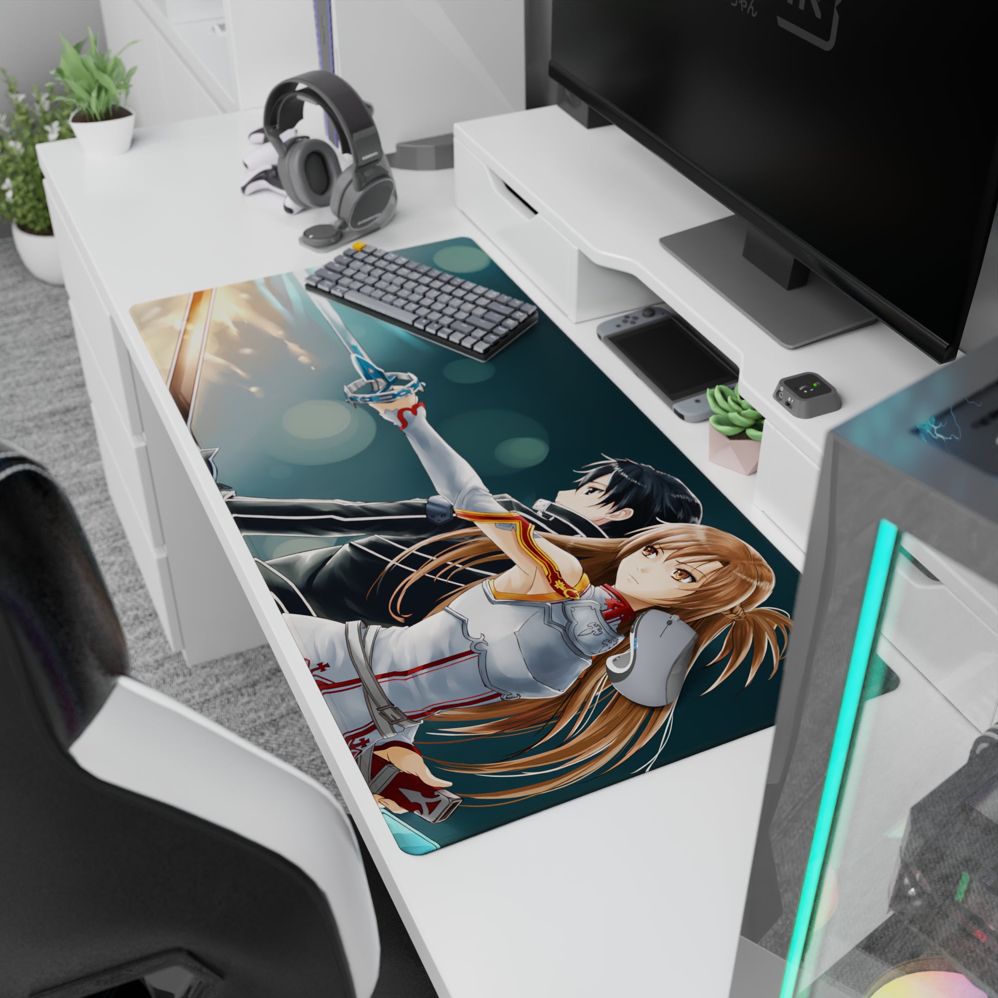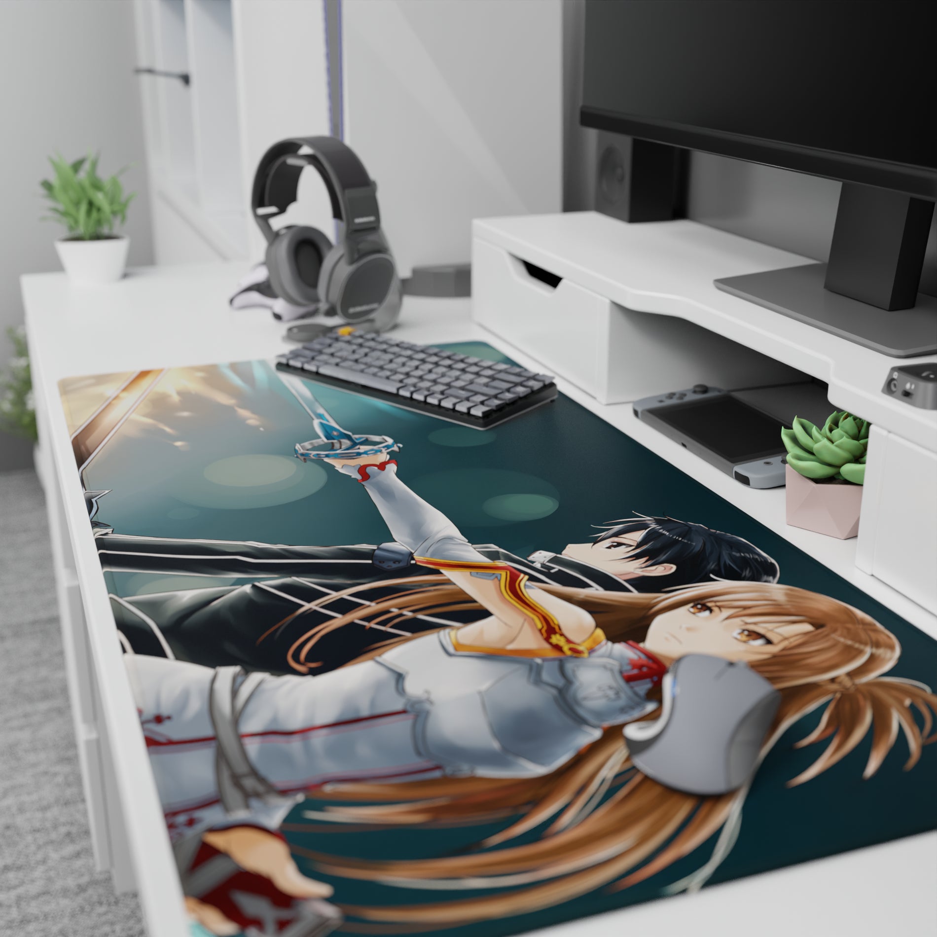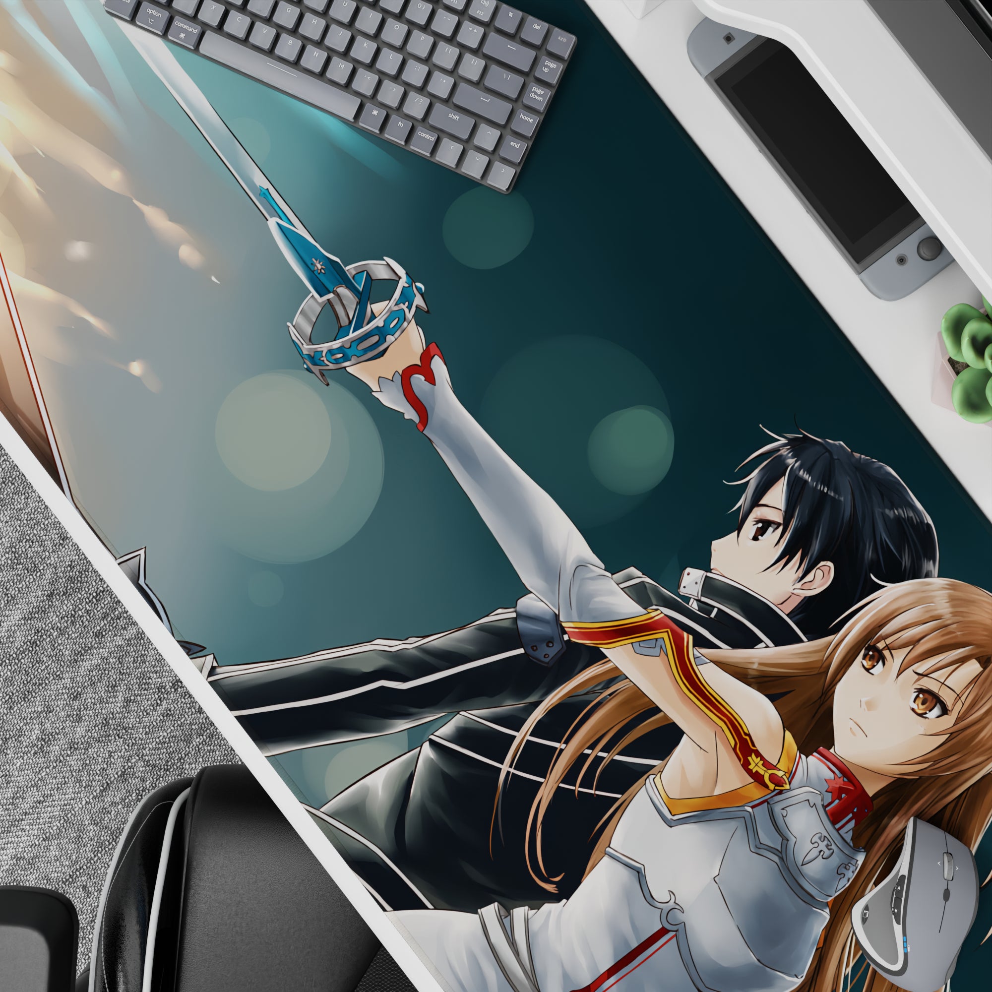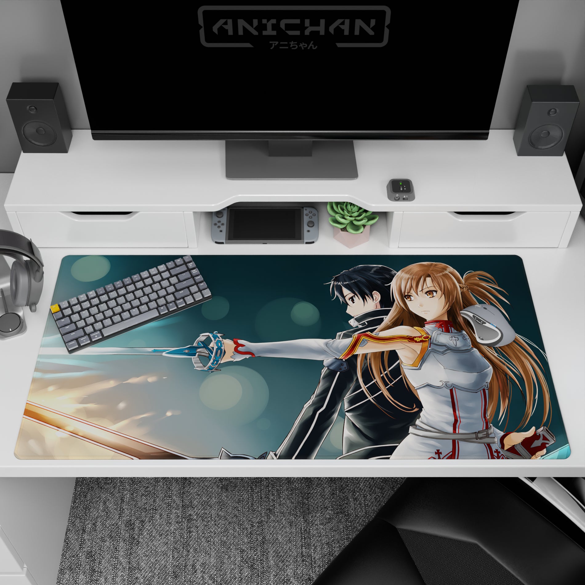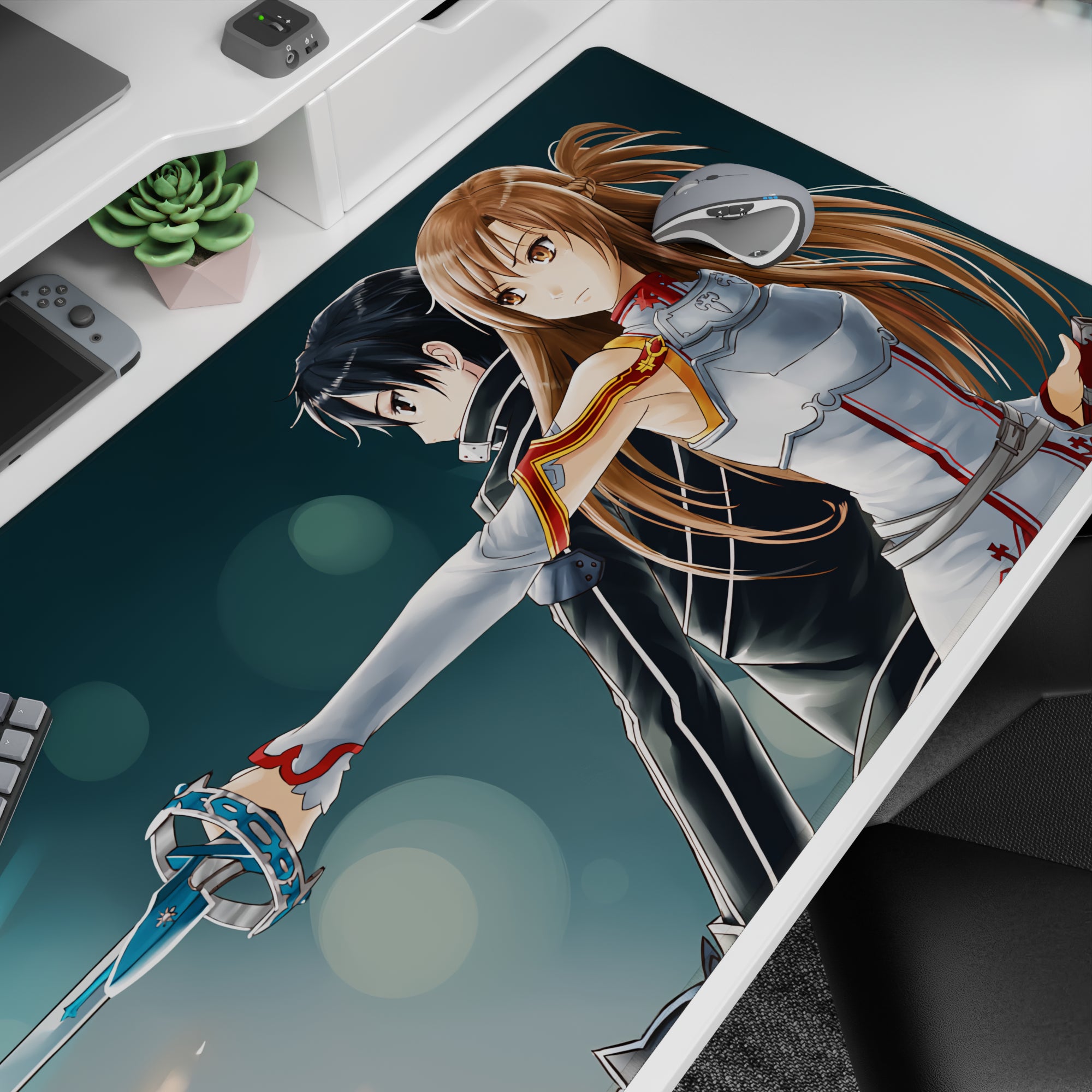 Anime desk pad 40x20 inches featuring Kirito and Asuna from Sword Art Online, swords glowing blue and amber.
