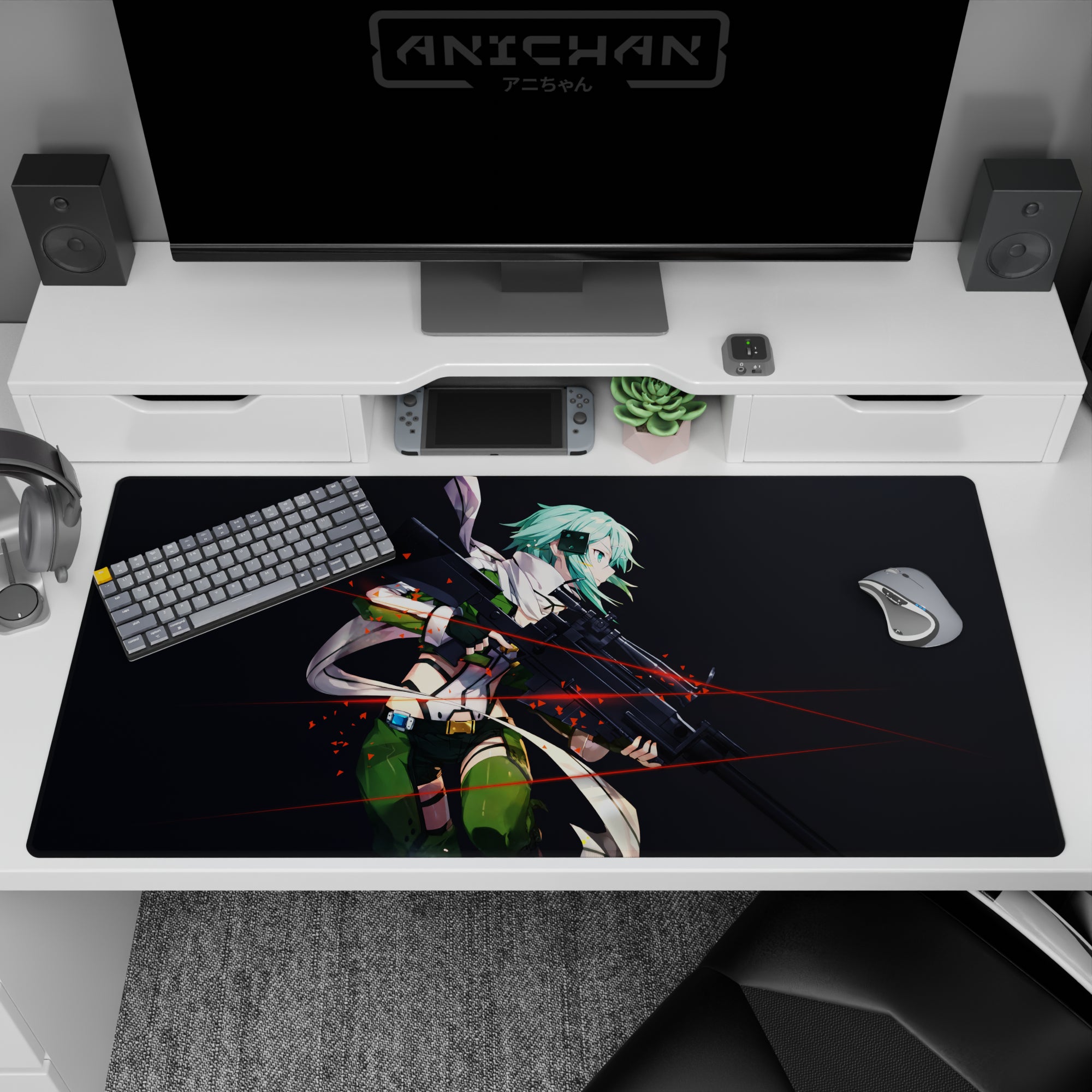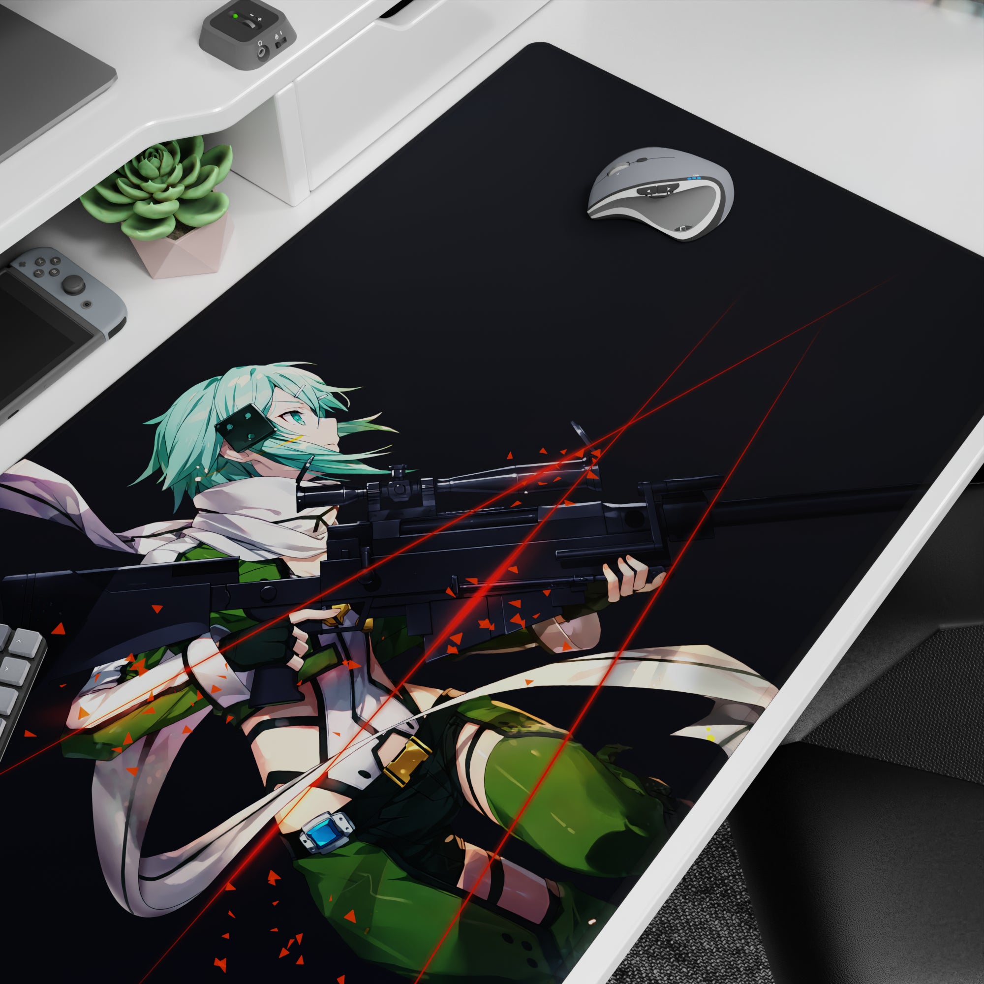 Immerse in the world of Sword Art Online with Sinon on this anime mouse pad. Her teal hair and intense gaze pop against a dark background, red lines adding action. Ideal for fans seeking a sleek, dynamic gaming setup. Designed for precision and style, it brings battle intensity to your desk.