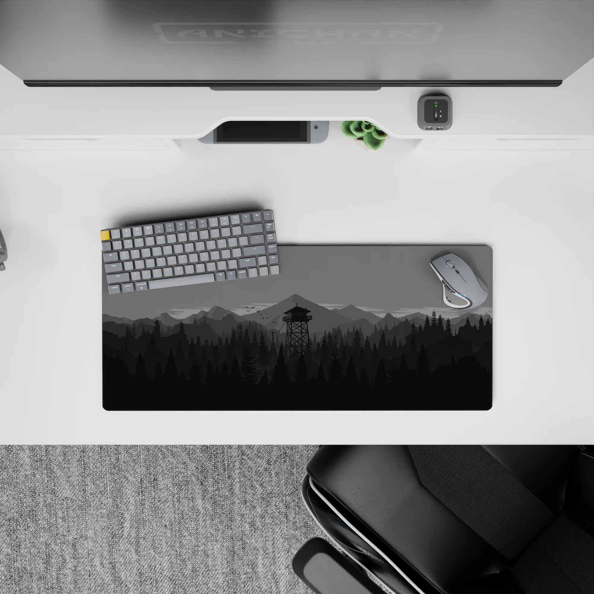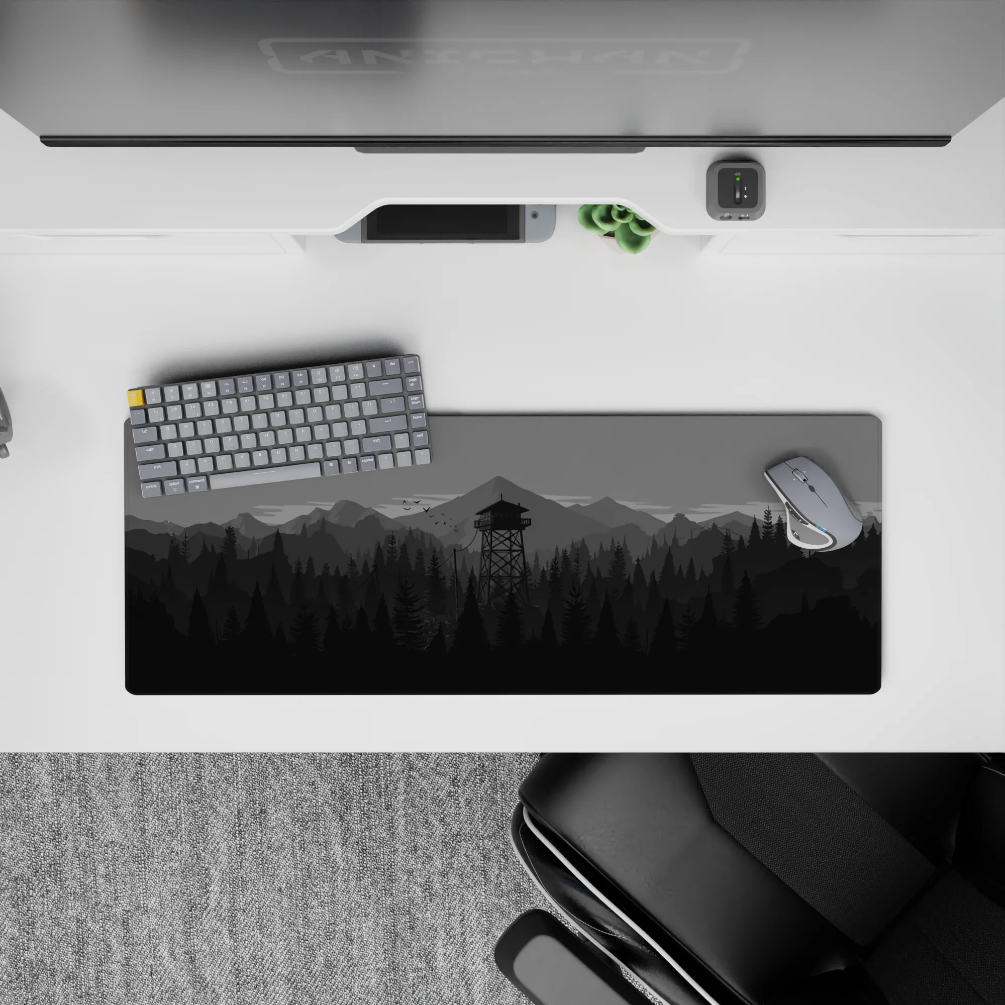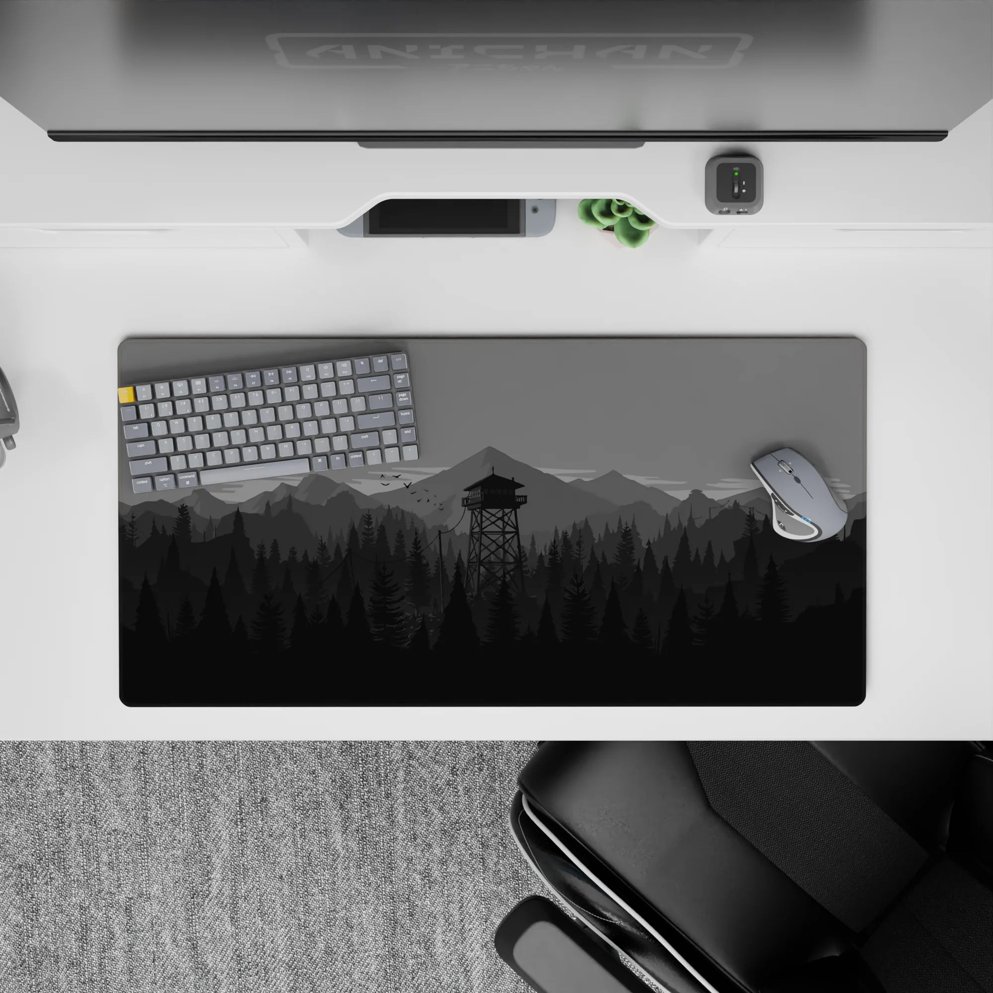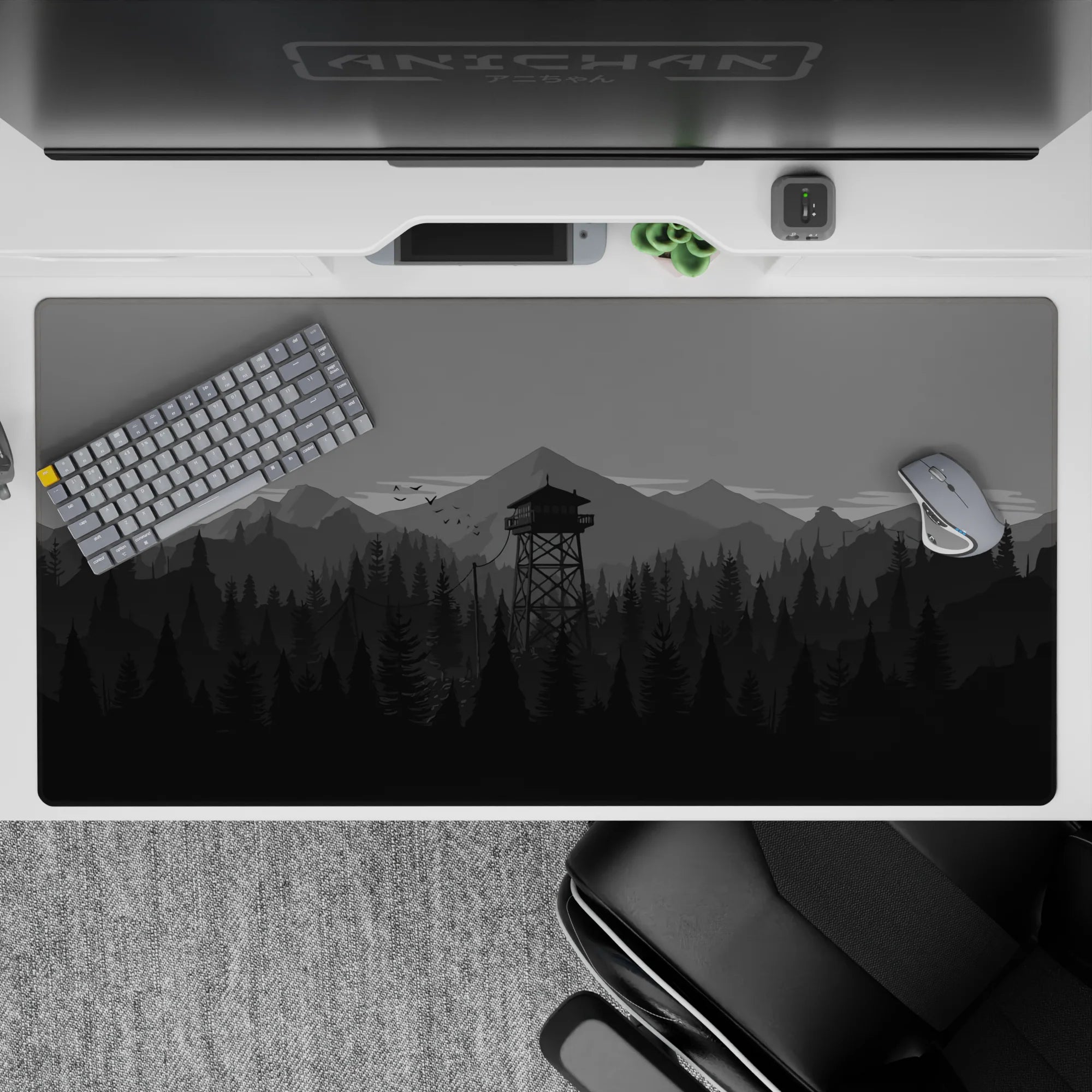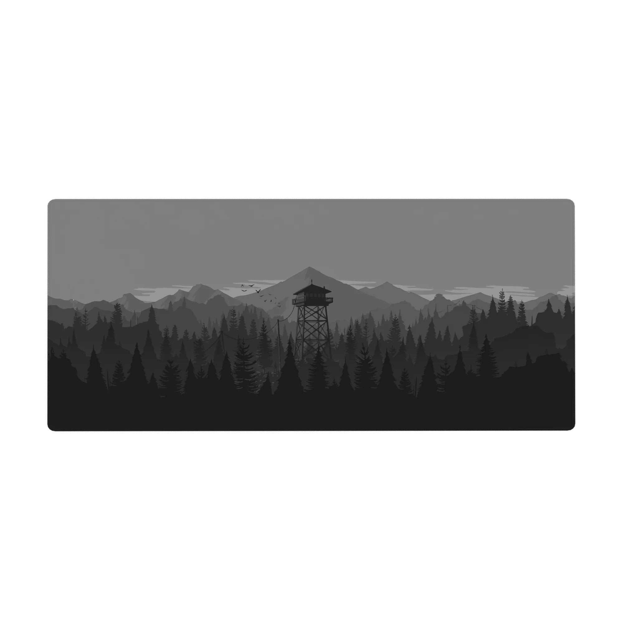 Discover the tranquil beauty of this monochrome deskmat, featuring a minimalist forest and watchtower design. Perfect for enhancing your workspace, this mousepad offers a sleek aesthetic and a comfortable surface for work or play.