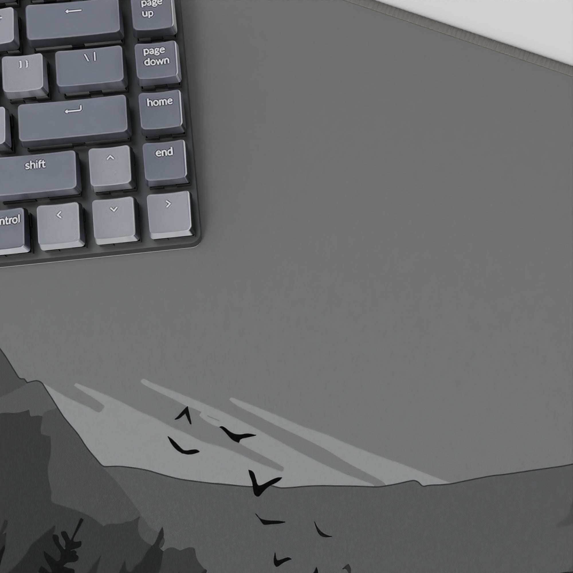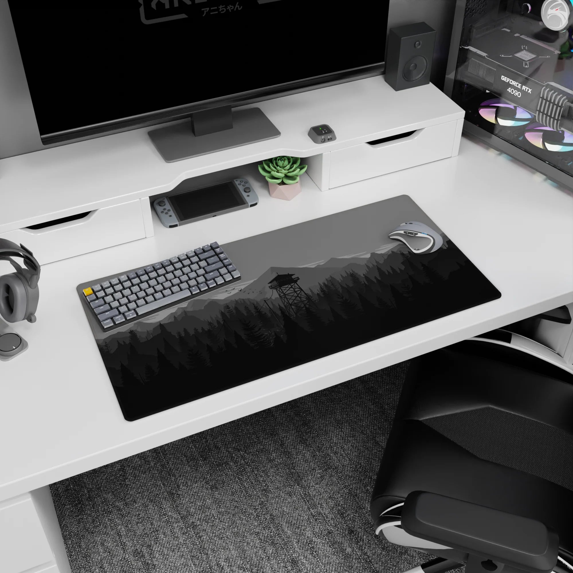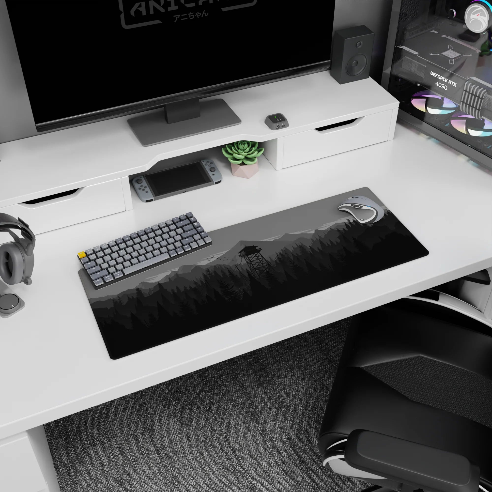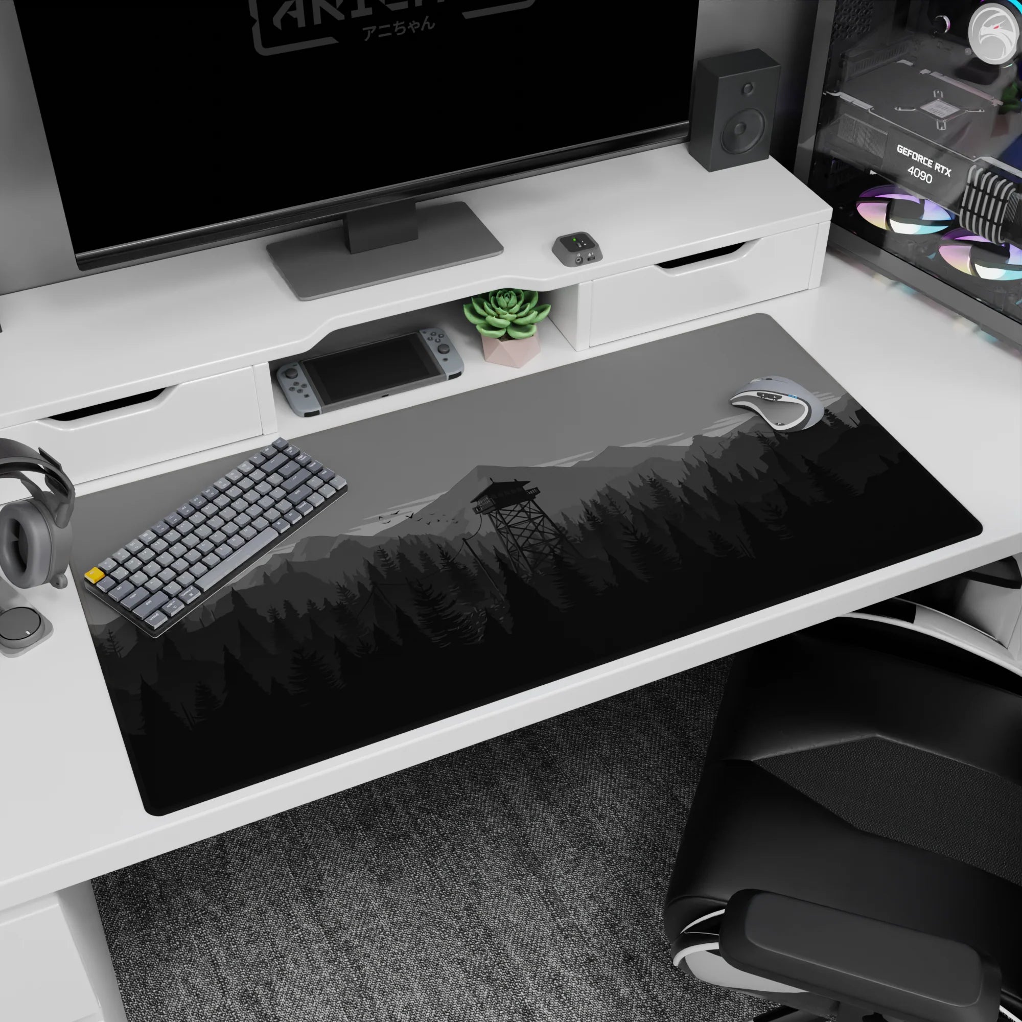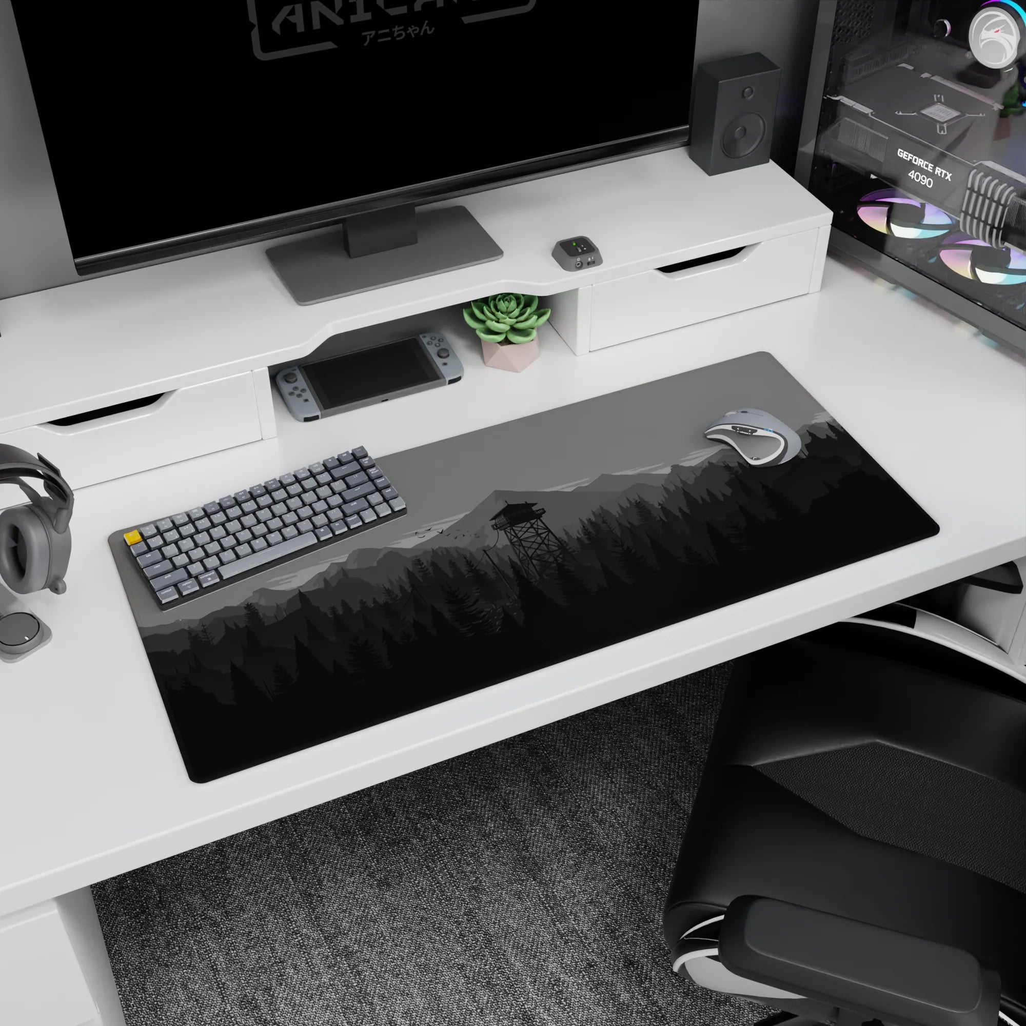 Discover the tranquil beauty of this monochrome deskmat, featuring a minimalist forest and watchtower design. Perfect for enhancing your workspace, this mousepad offers a sleek aesthetic and a comfortable surface for work or play.