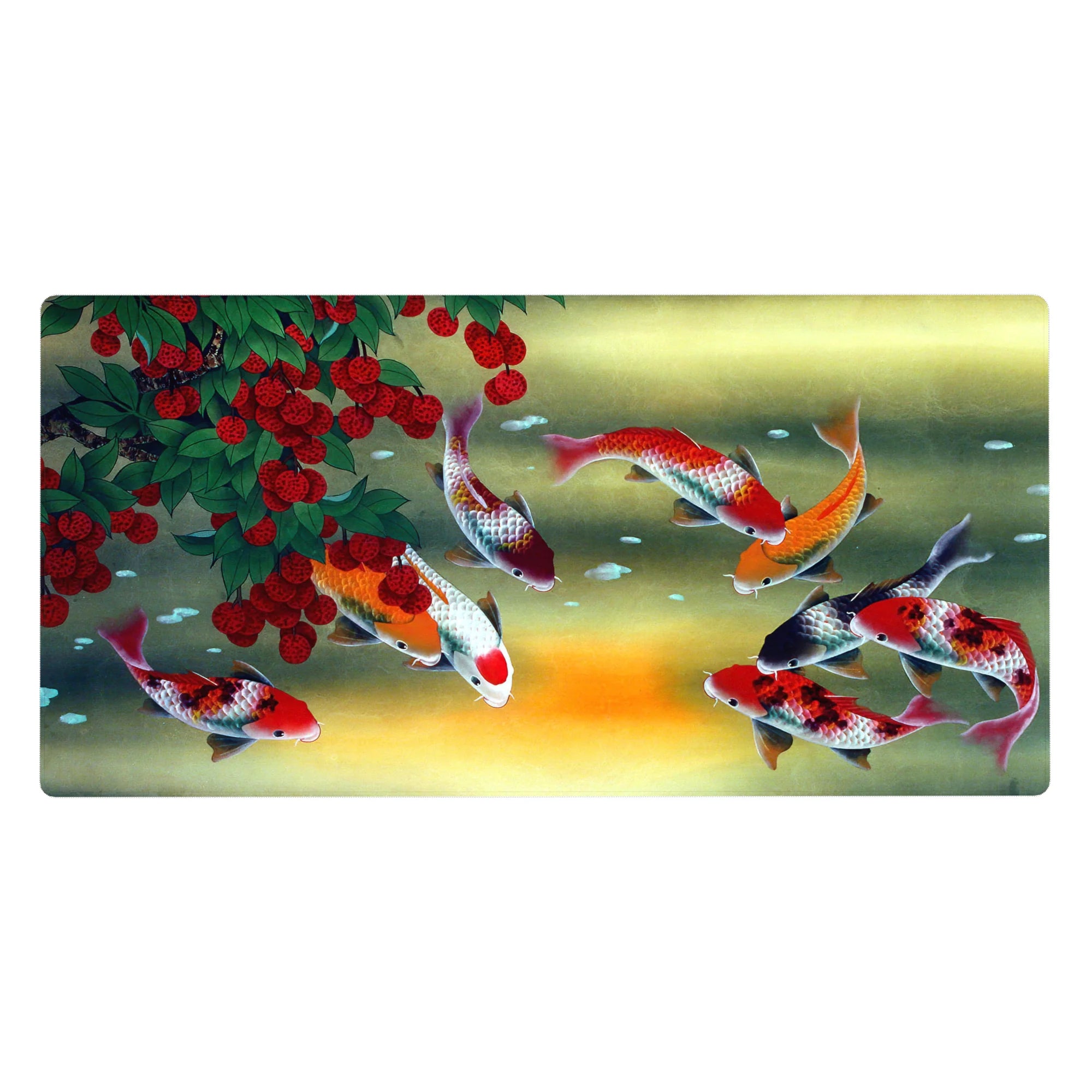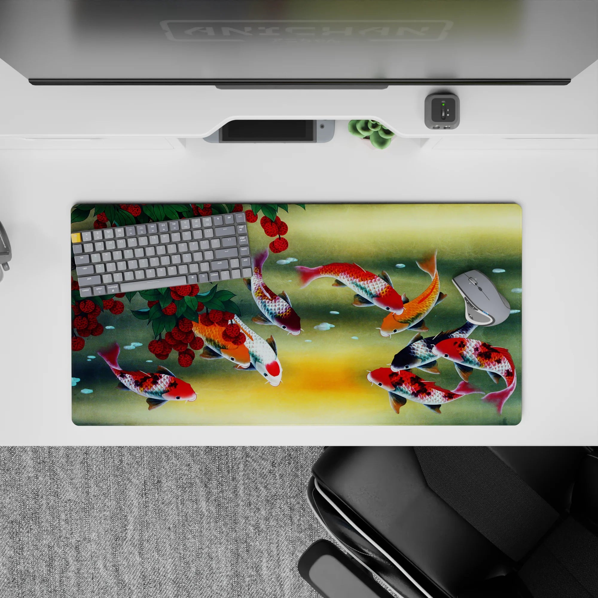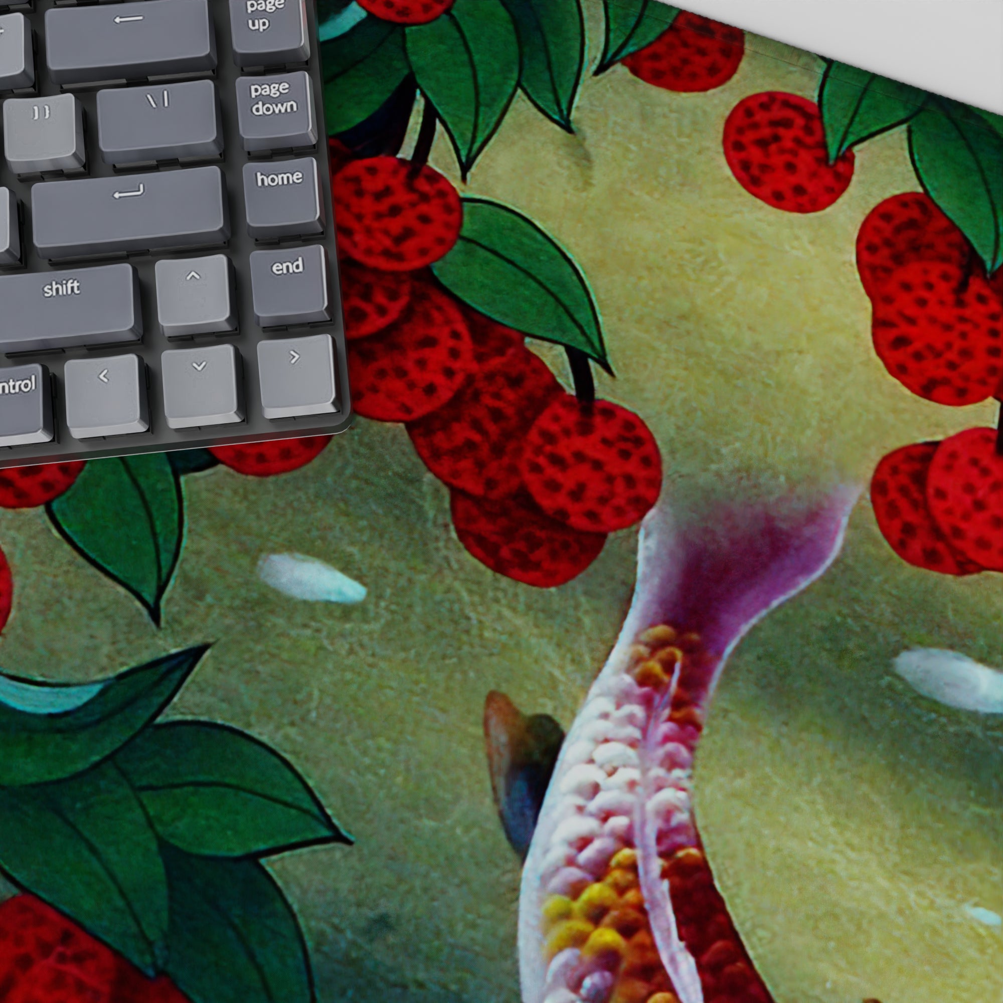 Immerse your workspace in serenity with this koi fish and cherry tree design. Vibrant koi glide beneath lush crimson cherries, their shimmering scales in hues of orange, red, and white. A symbol of peace, prosperity, and balance, this design brings natural beauty to any desk.