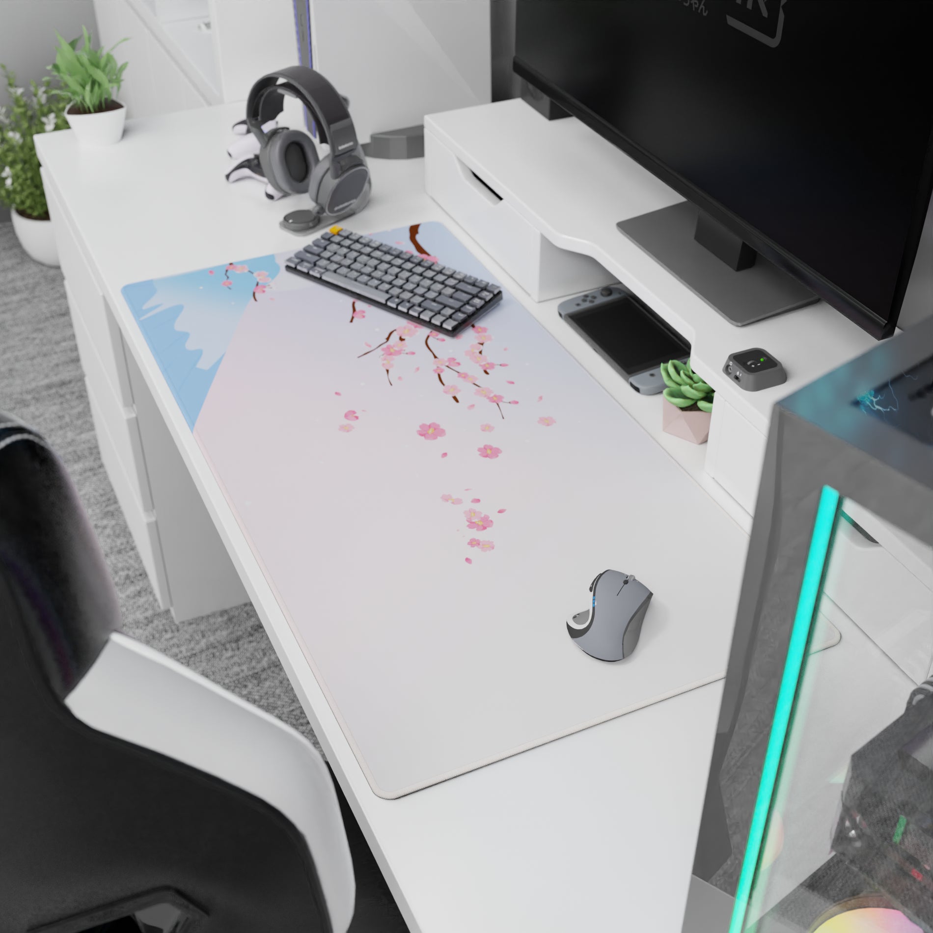 Capture the essence of spring with this cherry blossom design featuring soft pink petals gently falling against a pastel sky and serene Mount Fuji in the background. Perfect for adding elegance and tranquility to any workspace.